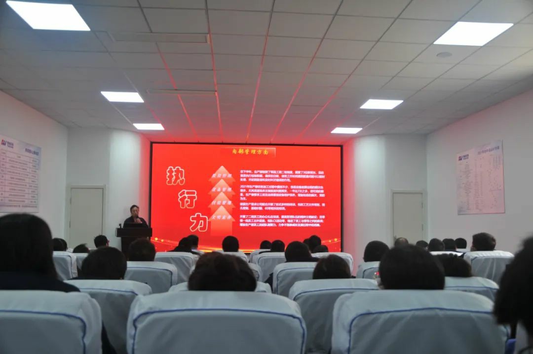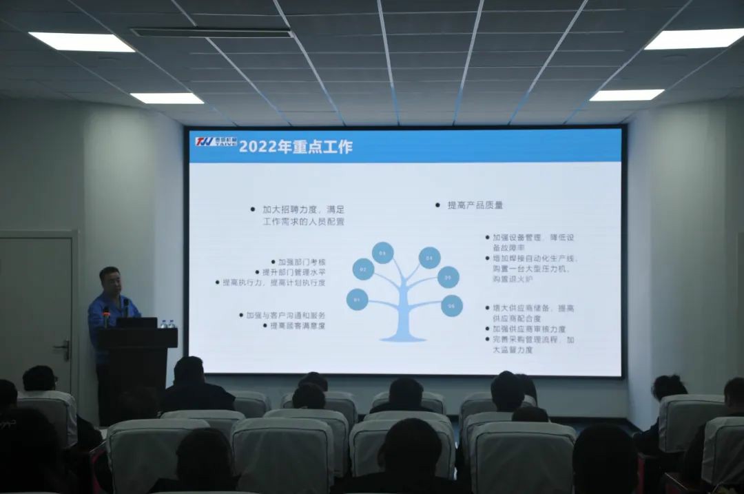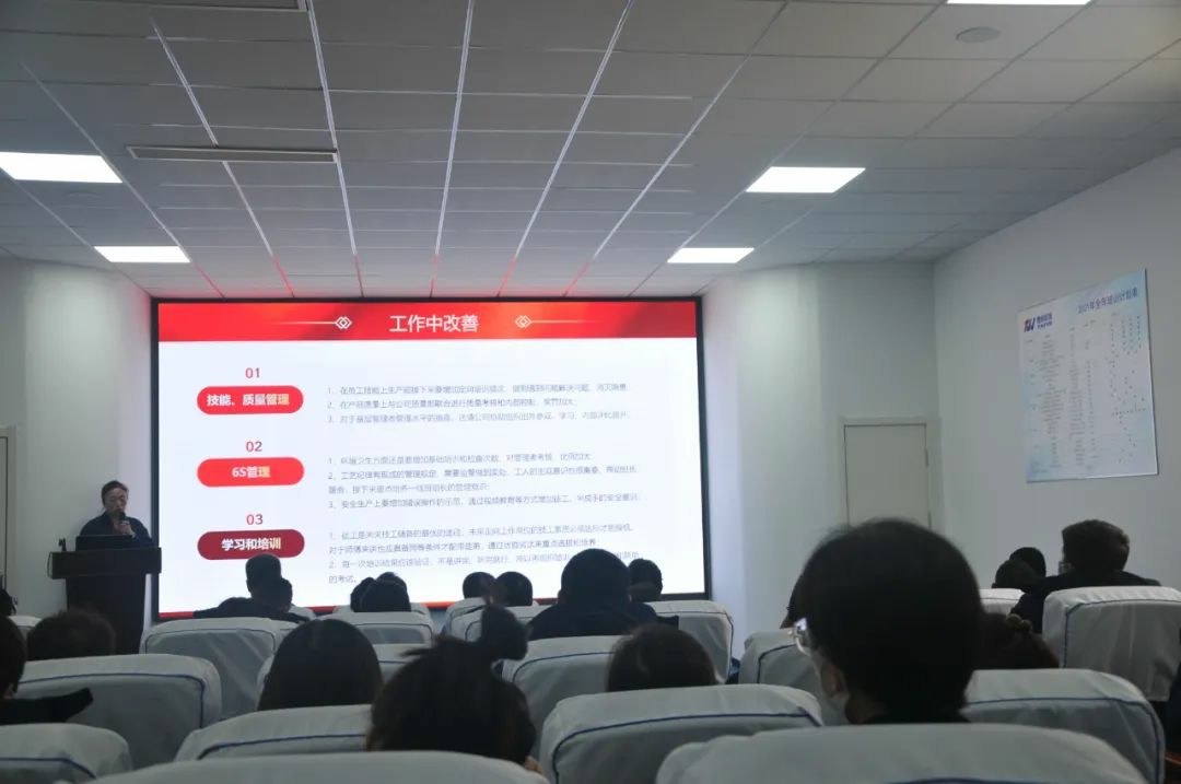 生產部部長從“去年工作回顧”“取得工作成果”“工作不足改善”“新年工作計劃”四個方面出發(fā),對2021的全年工作情況進行了總結概述,匯報了本年度生產任務的完成情況,重點強調了安全生產管理,提出要時刻做到“警鐘長鳴”,認真執(zhí)行安全操作管理規(guī)定,落實安全培訓,讓安全意識深入人心;展示了2021年各方面工作取得的成果,同時指出了工作中存在的不足及改善措施,并提出了相關建議,制定了2022年的工作目標。